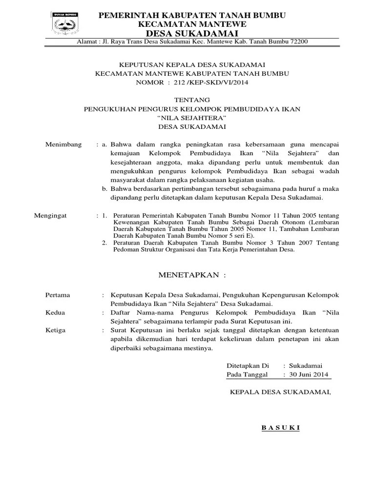 · bahwa dalam rangka peningkatan rasa kebersamaan guna pencapaian kemajuan kelompok budidaya ikan dan kesejahteraan anggota maka dipandang perlu untuk membentuk kelompok budidaya ikan sebagai wadah musyawarah dalam. Berikut adalah contoh sk pengangkatan pengurus tim penggerak pkk desa yang dibuat oleh kepala desa surat keputusan kepala desa m. Surat keputusan kepala desa damar indah nomor : sk izin pemanfaatan hutan perhutanan sosial kepada kelompok tani rimba agro abadi di desa mendelem, desa simpur, kecamatan belik, kabupaten pemalang, provinsi jawa tengah seluas 794 ha bagi 739 kk; Berdasarkan sk menteri pertanian ri nomor :